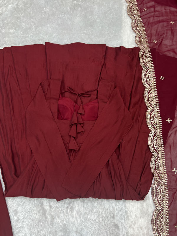 Maroon Colour Roman Silk Chanderi Plain Anarkali Kurti