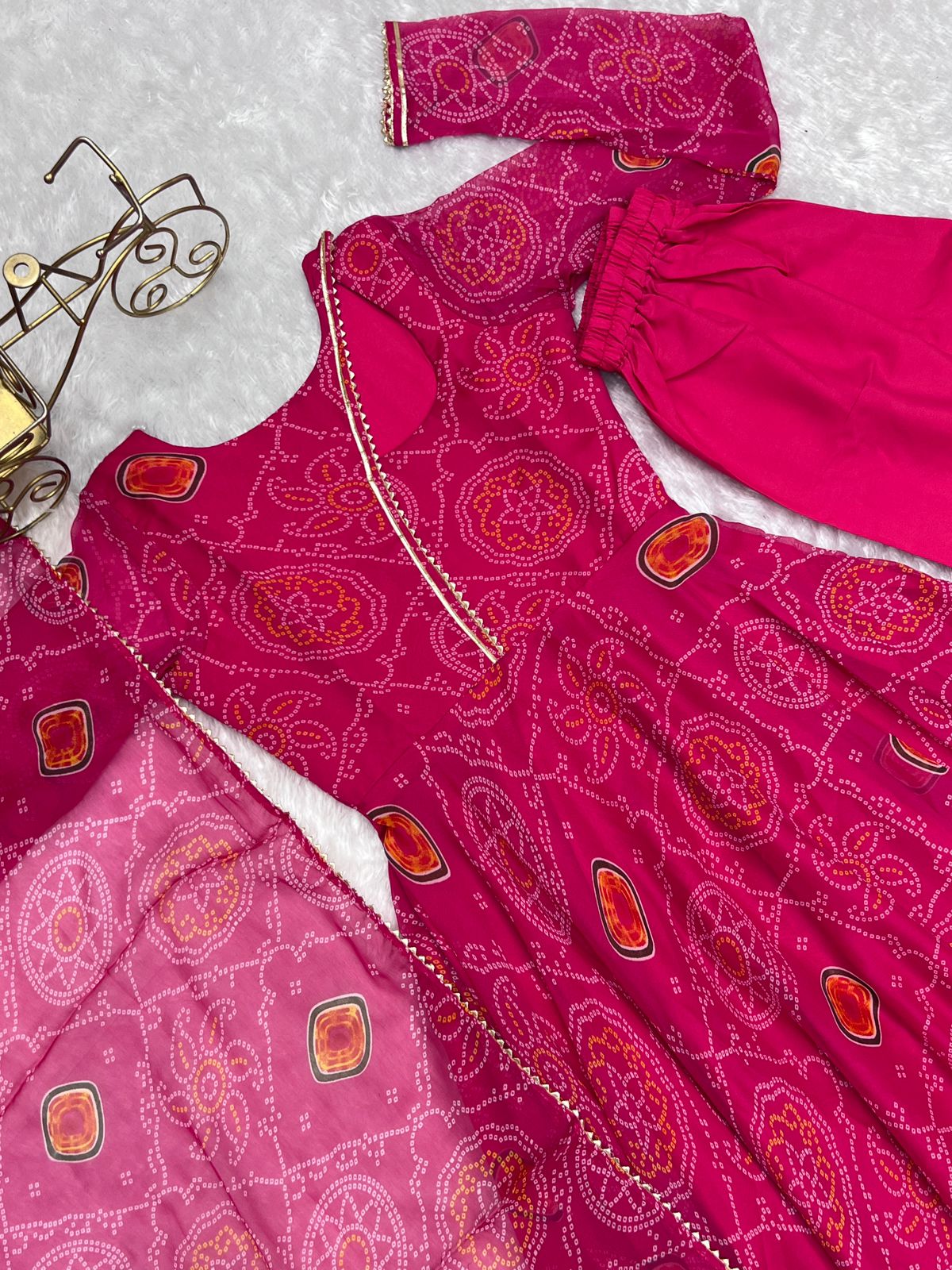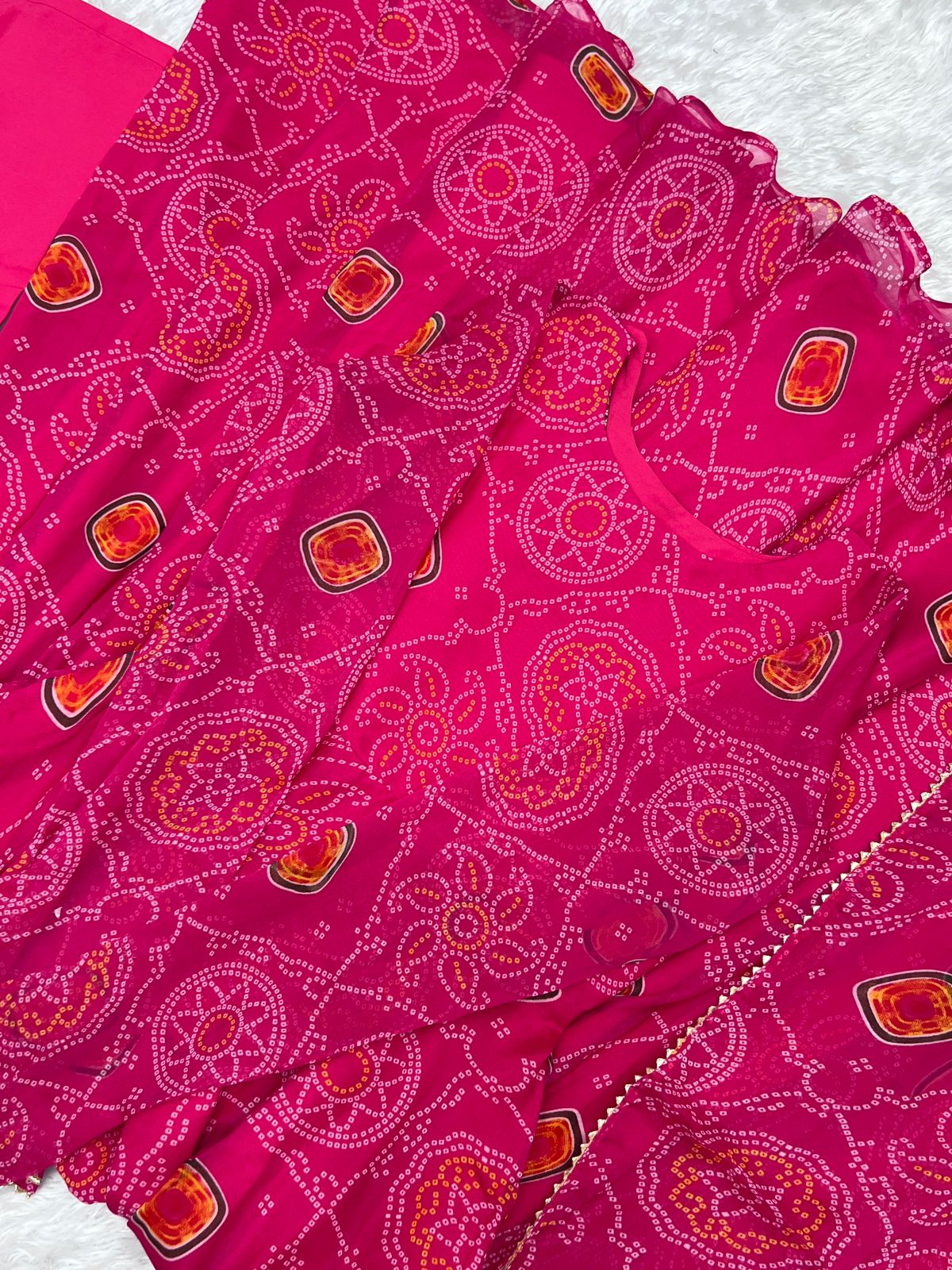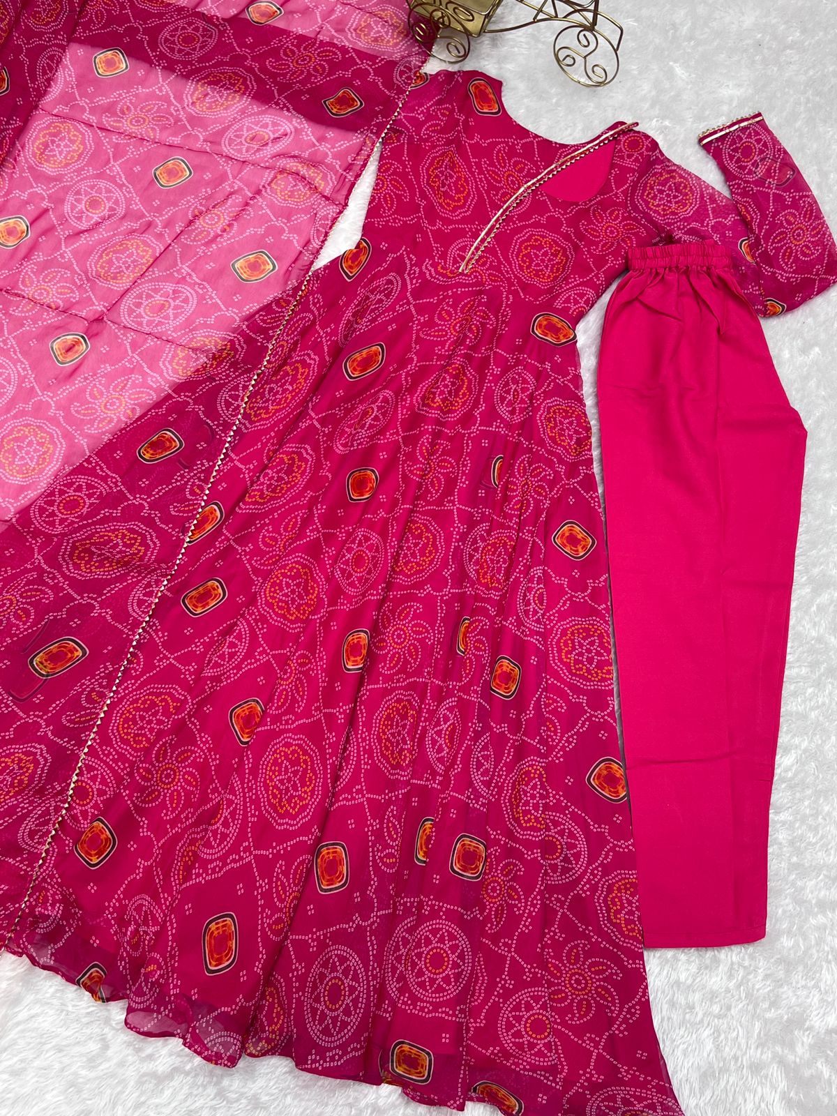 - Designer Set: Presenting a new designer Pure Soft Lightweight Chiffon Bandhej Fully Flair Gown Set, including a dupatta and pant, all fully stitched and ready to wear.