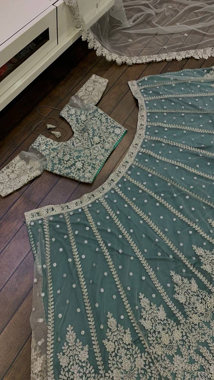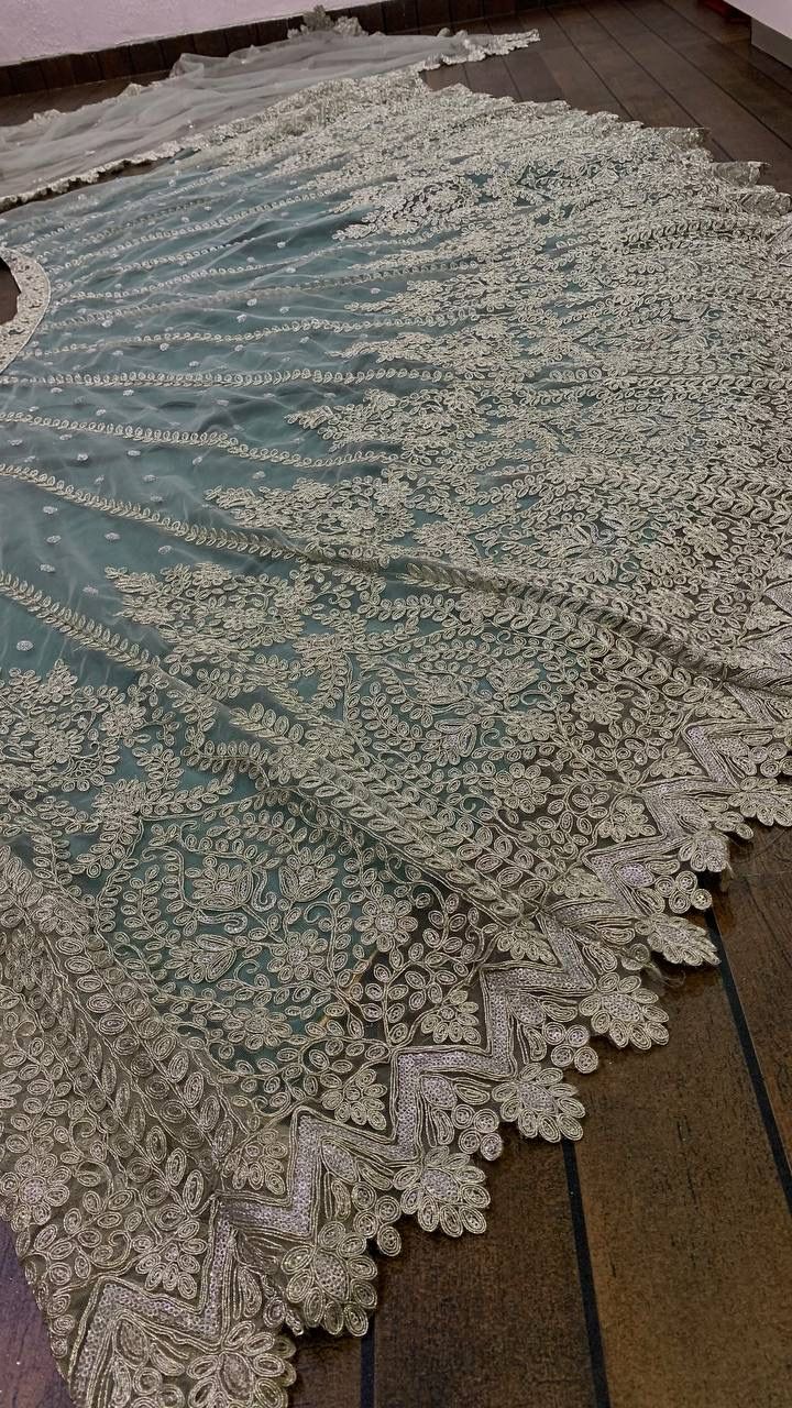 Mint Green Net with Heavy Dori Embroidery, Stone and Sequins Work Lehenga Choli