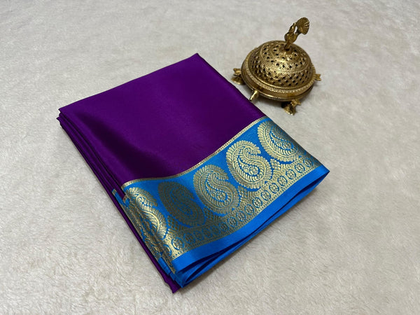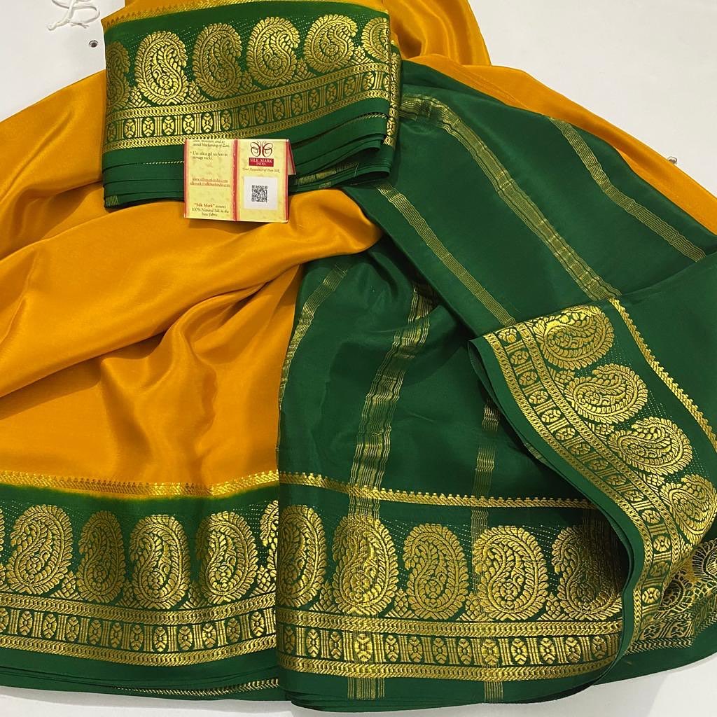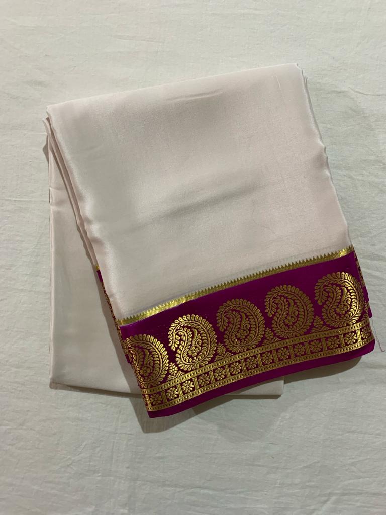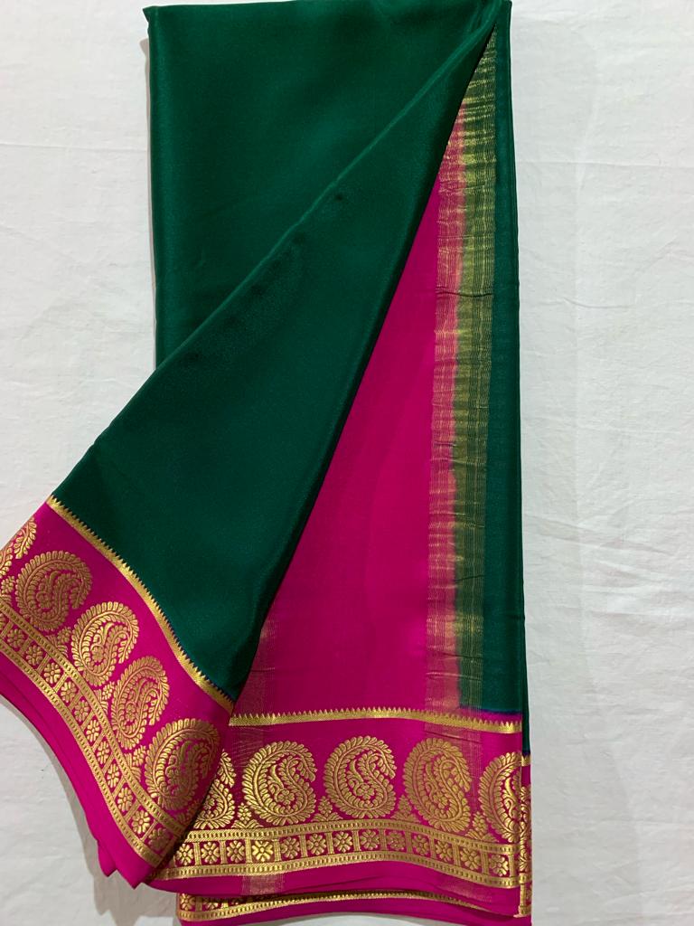Experience elegance with our Semi Mysore Crepe Silk Saree, featuring a 5.5-meter length and a fancy border. Crafted from soft and comfortable semi Mysore silk, it's perfect for any weather and ideal for festive occasions and the wedding season.