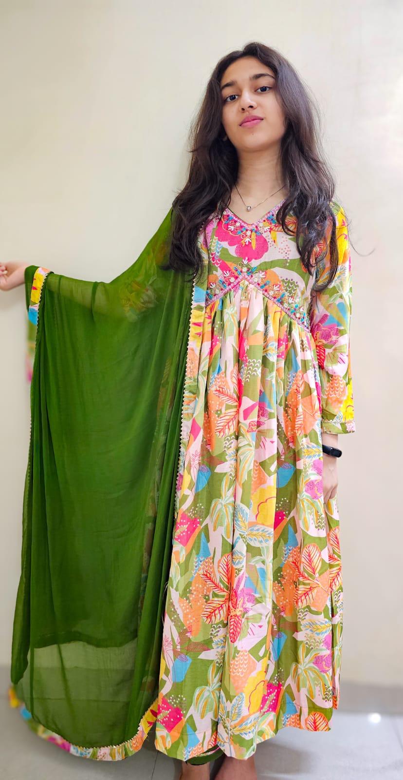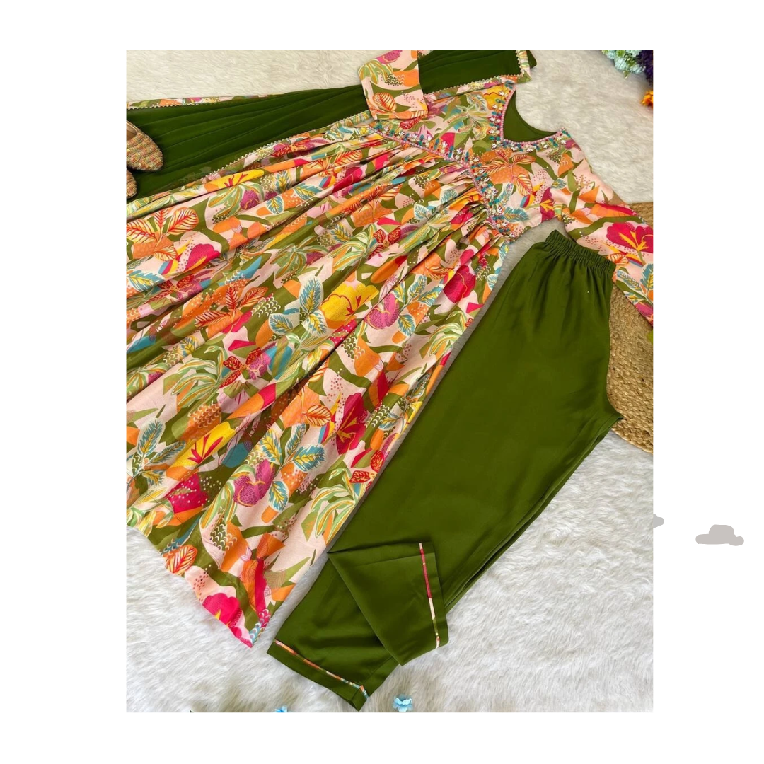 Introducing a stunning party wear ensemble featuring an Aliya cut dress, dupatta, and pant 🌺. Crafted from soft Chinon fabric with digital prints and beautiful handwork, this outfit is perfect for special occasions.