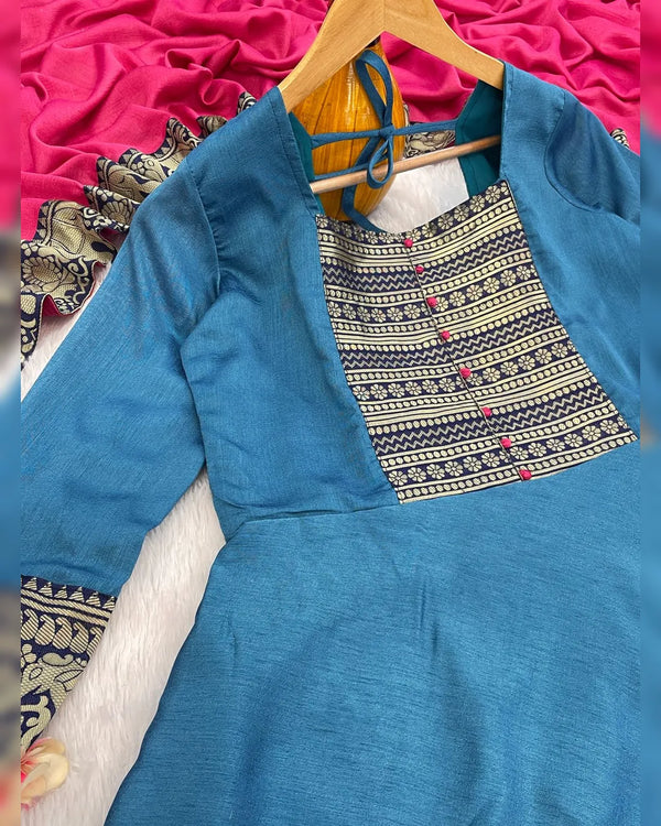 Embrace elegance with our Super Hit Vichitra Silk Gown, crafted from premium Vichitra Silk and adorned with intricate jacquard zari weaving for a regal touch. Perfect for festive occasions, weddings, and special events, this exquisite gown pairs beautifully with the matching elegant dupatta for a refined, sophisticated look✨